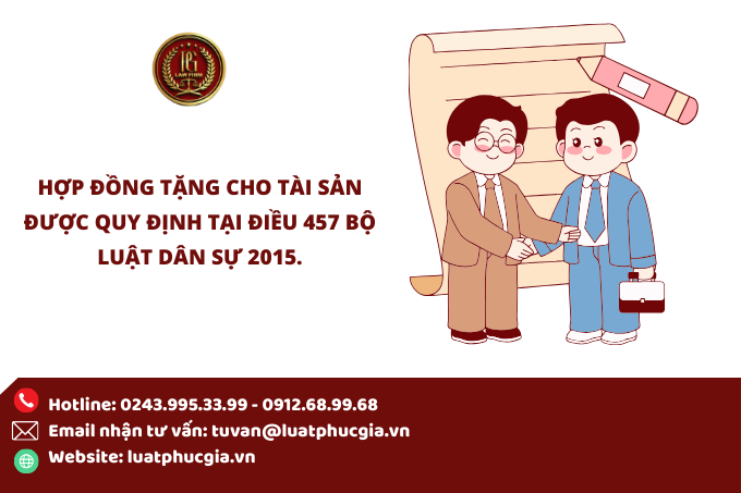 - Điều 457 Bộ Luật Dân sự 2015 quy định hợp đồng tặng cho tài sản như sau: “Hợp đồng tặng cho tài sản là sự thỏa thuận giữa các bên, theo đó bên tặng cho giao tài sản của mình và chuyển quyền sở hữu cho bên được tặng cho mà không yêu cầu đền bù, bên được tặng cho đồng ý nhận”.